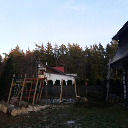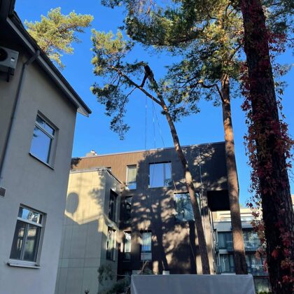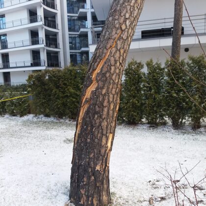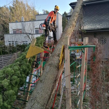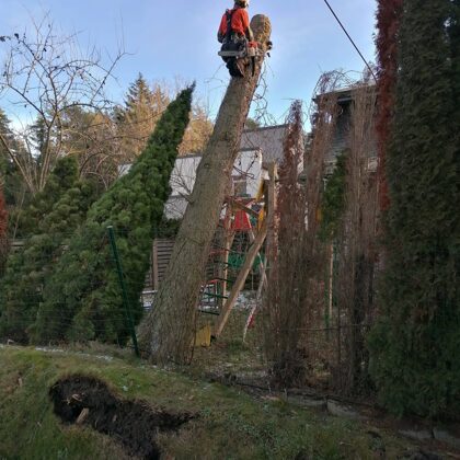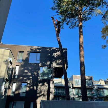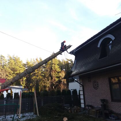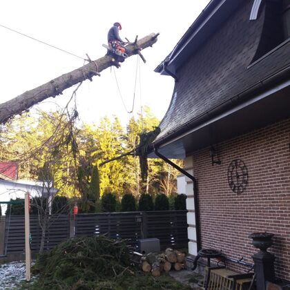 Veicam visa veida sarežģītības koku zāģēšanu (noņemšanu). Piemēri fotogrāfijās ar sarkano ceļamkrānu - koks (parastais osis), nolūzis pie celma, koka kopsvars aptuveni 10 tonnas, sadalot to daļās, tas tika demontēts, nebojājot apakšā esošo būvi. Pirms darbu izpildes veicam vietas apsekošanu (atkarībā no situācijas pat vairākkārt, ja tas nodrošina kvalitatīvu darbu izpildi), sastādām tāmi un nosakām darbu izpildes laiku.